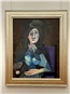 小さな丸帽子を被って座る女性